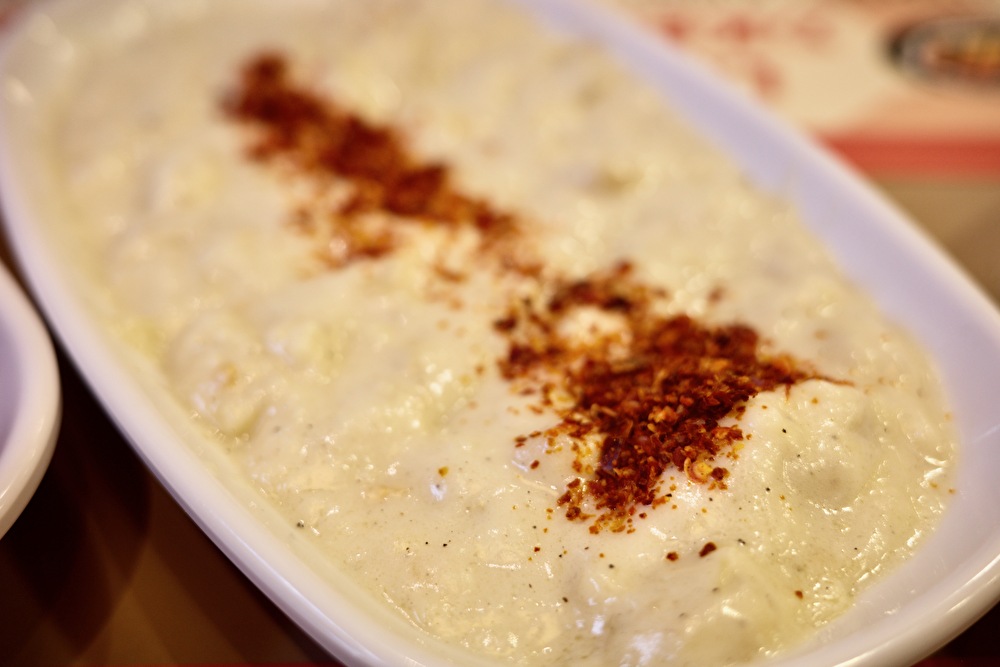 お皿いっぱいに肉が広げられています。その上にはトマトソース。そしてヨーグルトが脇に添えられています。