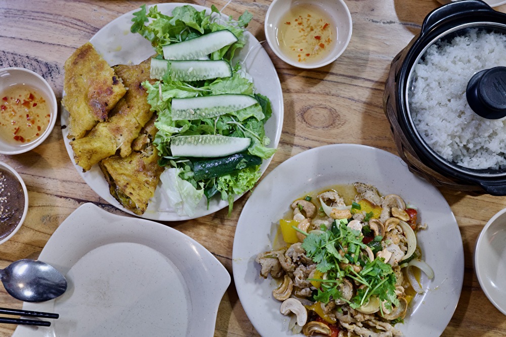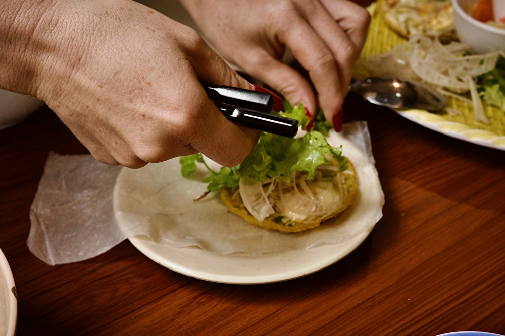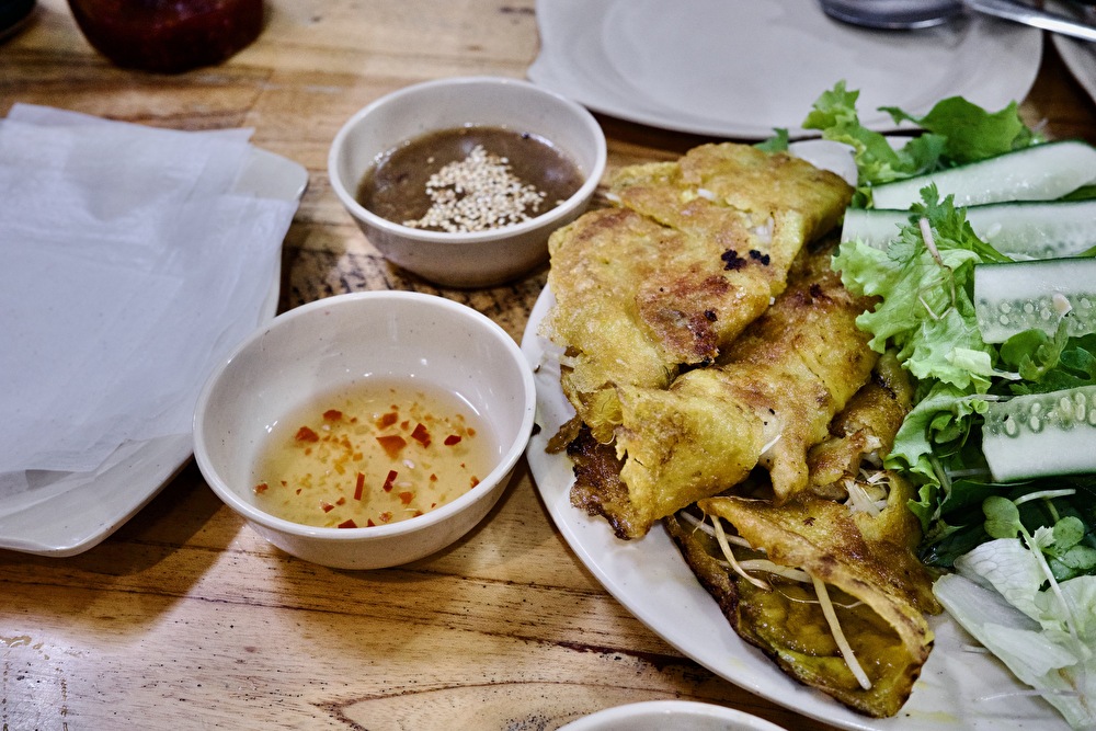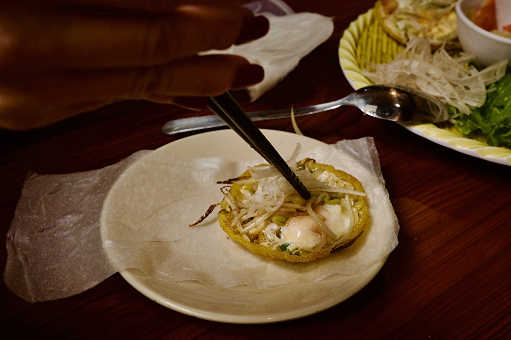 日本では「ベトナム風お好み焼き」と紹介されることもありますが、食べてみたら全く別物でした。実際にはクレープのような薄い生地の上に、肉や野菜、ハーブを組み合わせて焼いたベトナムらしい独特の食べ方が魅力です。