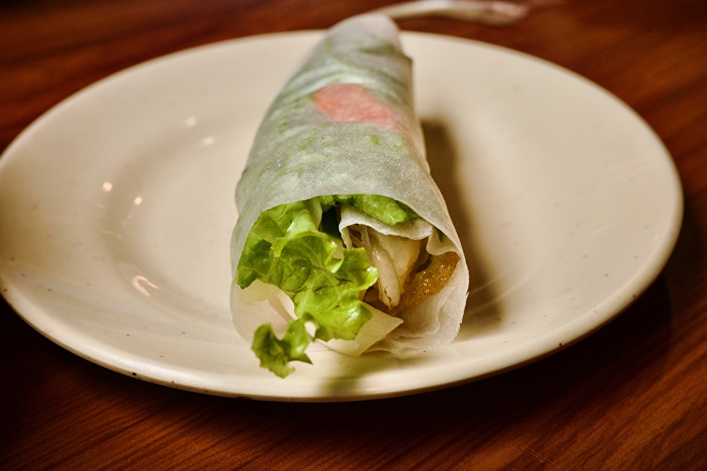 具がたっぷり入っていて生野菜もどっさり添えられています。ライスペーパーの上に、全てを乗せてクルクル巻いて食べます。野菜が多いのでサラダを食べている感じです。